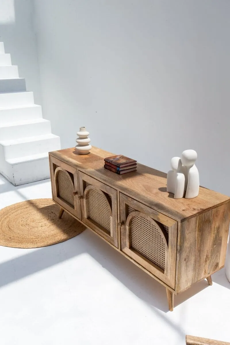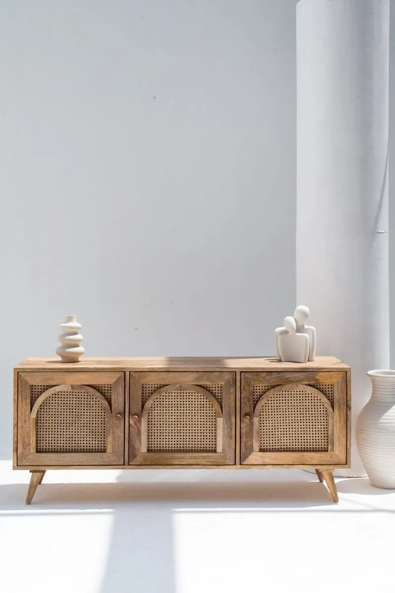 This TV unit is crafted from high-quality mango wood with a natural finish. Featuring three elegant arch doors, it combines style and functionality, offering a sturdy and sophisticated centerpiece with ample concealed storage for a neat and organized living space.