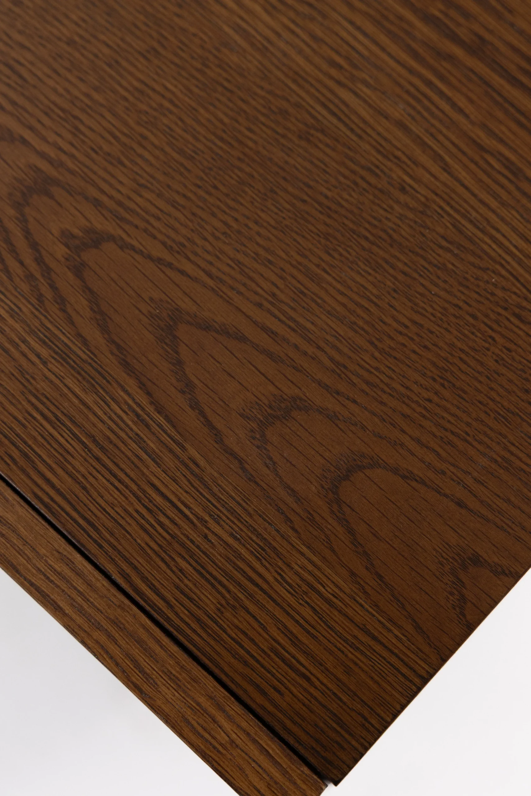 This TV unit features a rich dark wood finish with a clean rectangular design and sturdy legs. The minimalist style enhances modern interiors, while spacious compartments provide practical storage to keep media devices and accessories neatly organized.