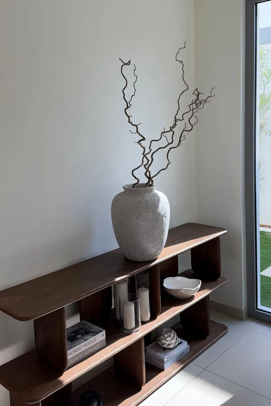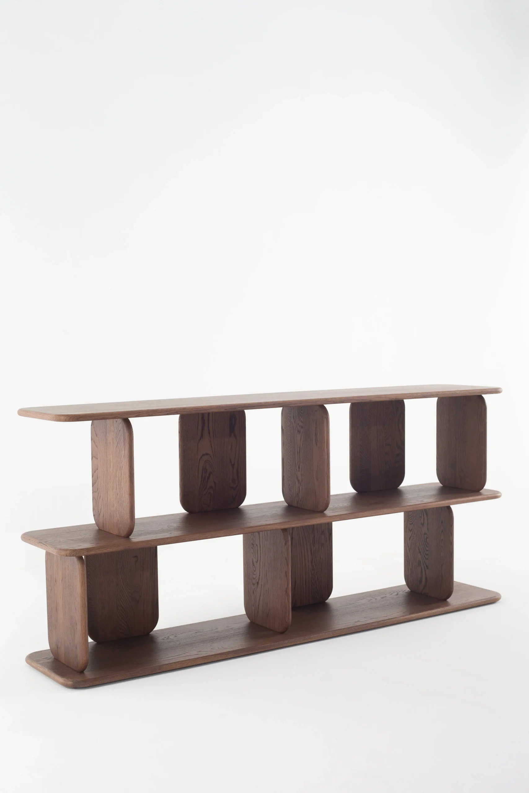 This display shelf features a rich dark wood finish with a clean open design that enhances modern interiors. Multiple shelves provide ample space for books, décor, and accessories, while the sturdy structure and elegant wood grain create a balanced and organized display.