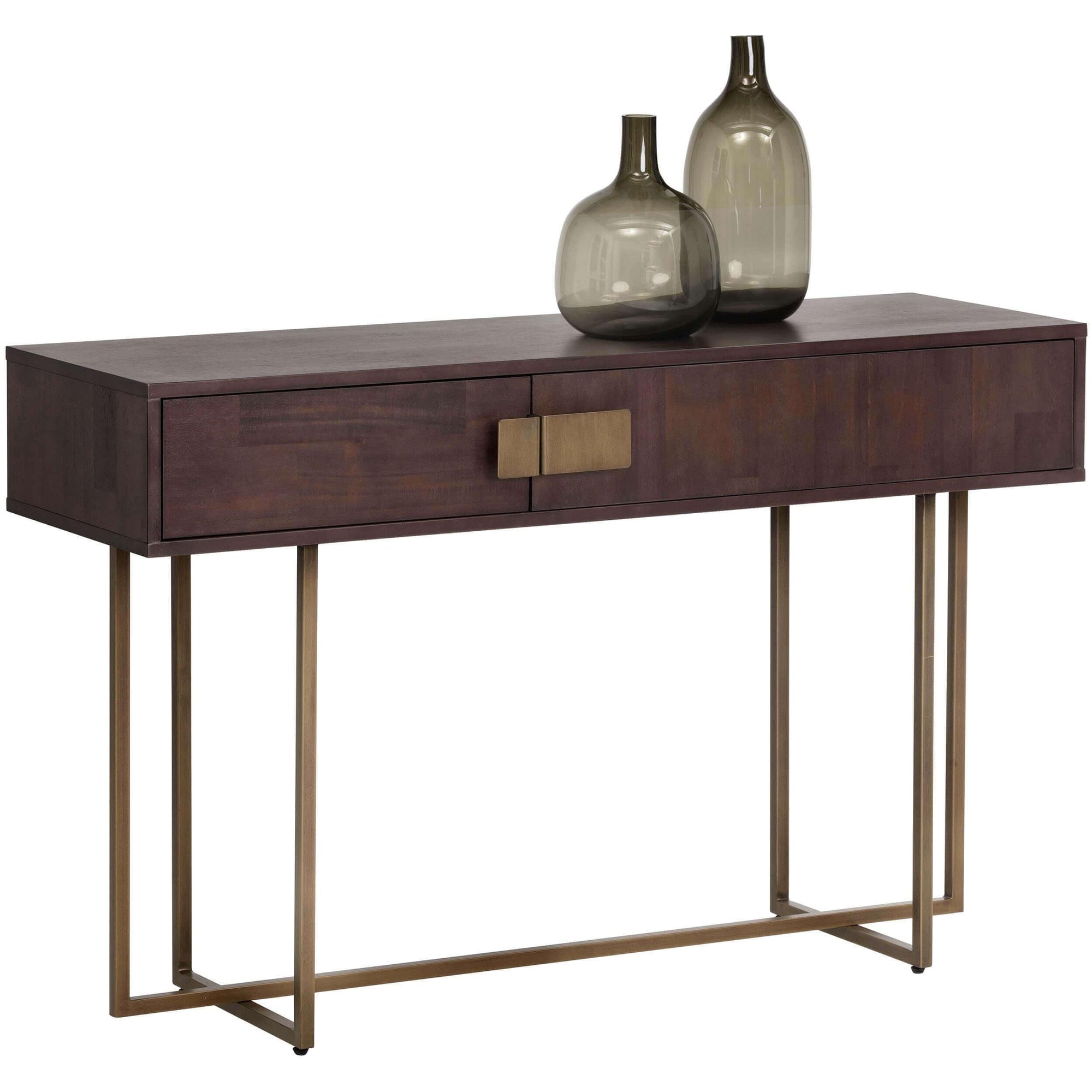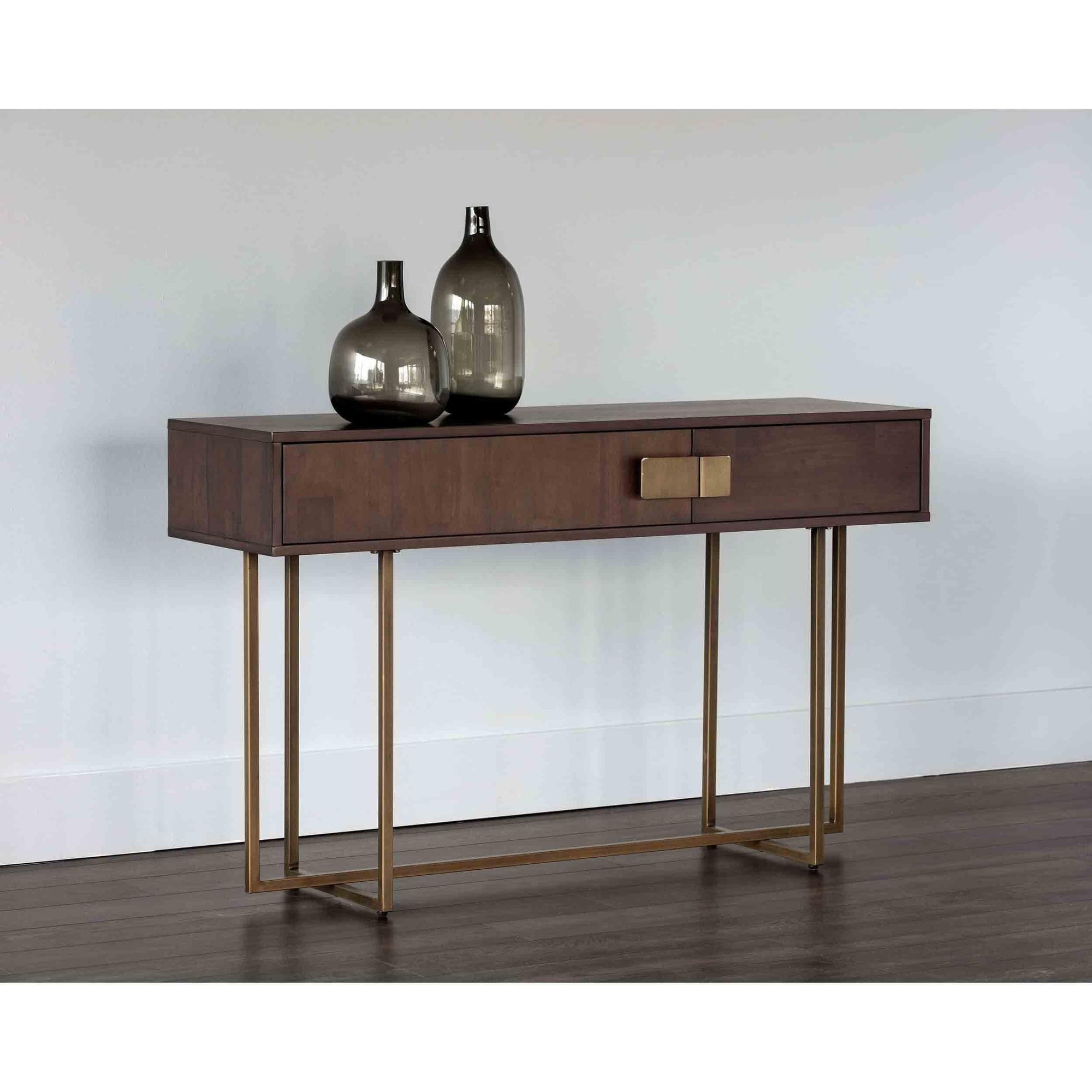 This stylish console table enhances foyers, living, or dining spaces with a refined transitional design. It features two soft-closing drawers with alternating wood grain patterns and elegant antique brass hardware for added character. Crafted from MDF with acacia veneer and supported by a stainless steel base with an antique brass finish, it offers durability and modern appeal in a 51”W x 15.75”D x 31.5”H size.
