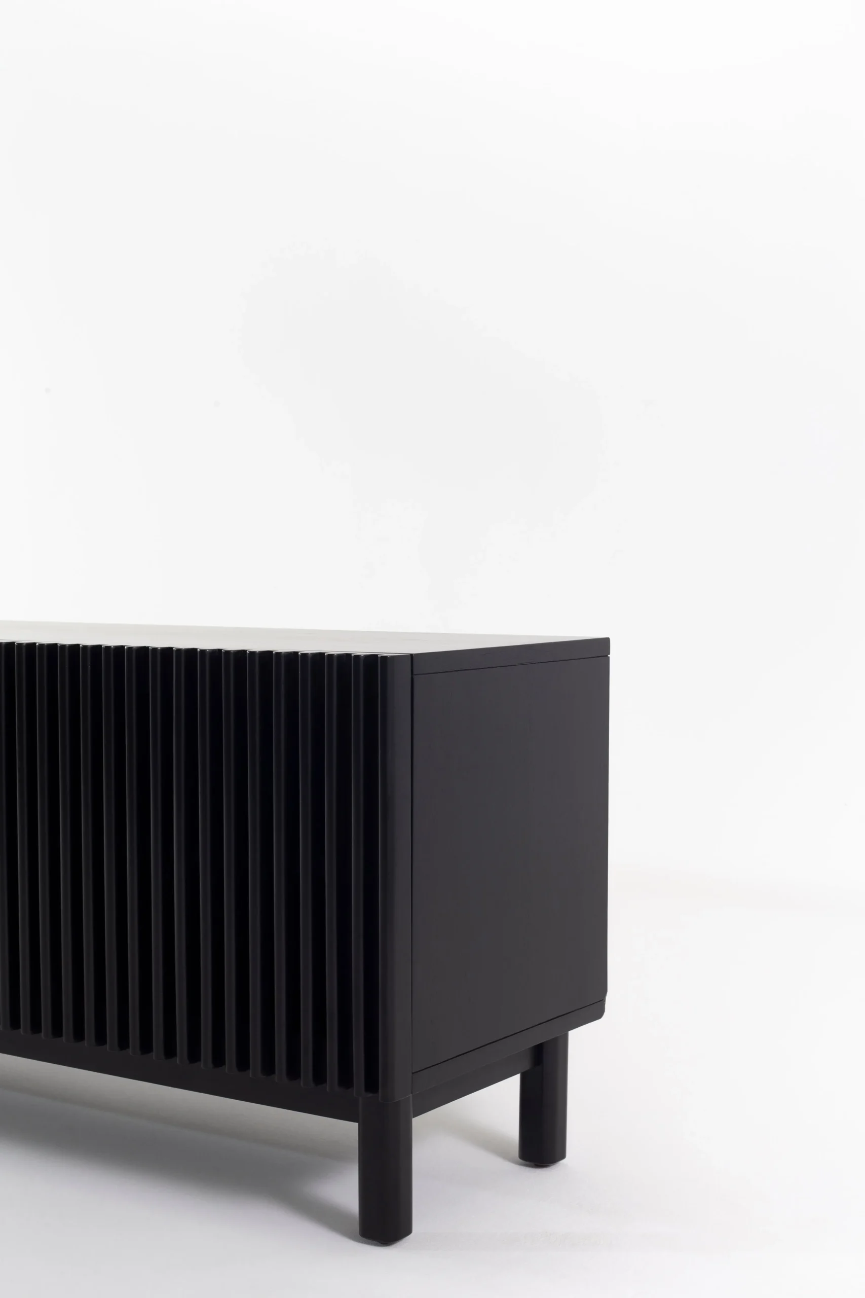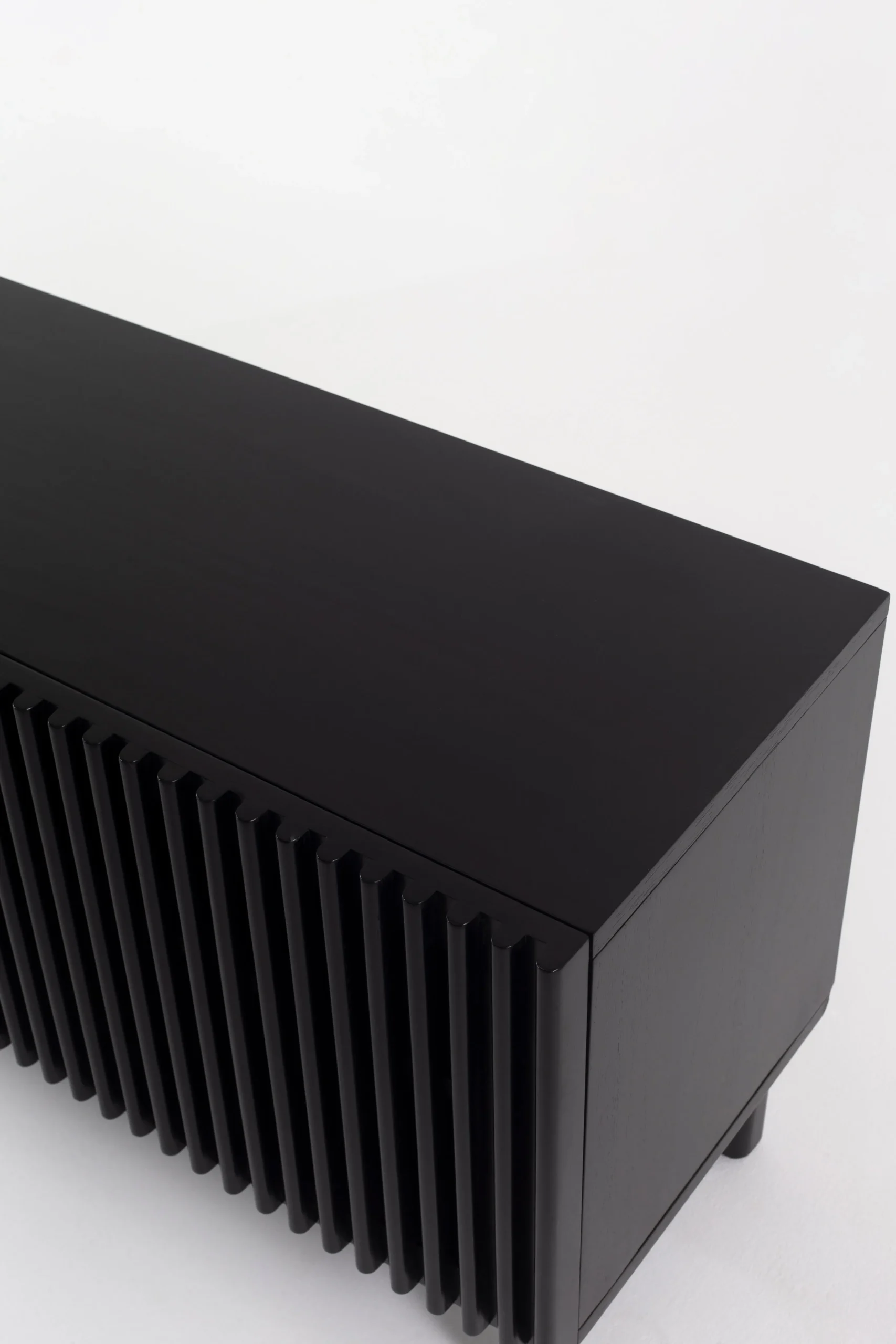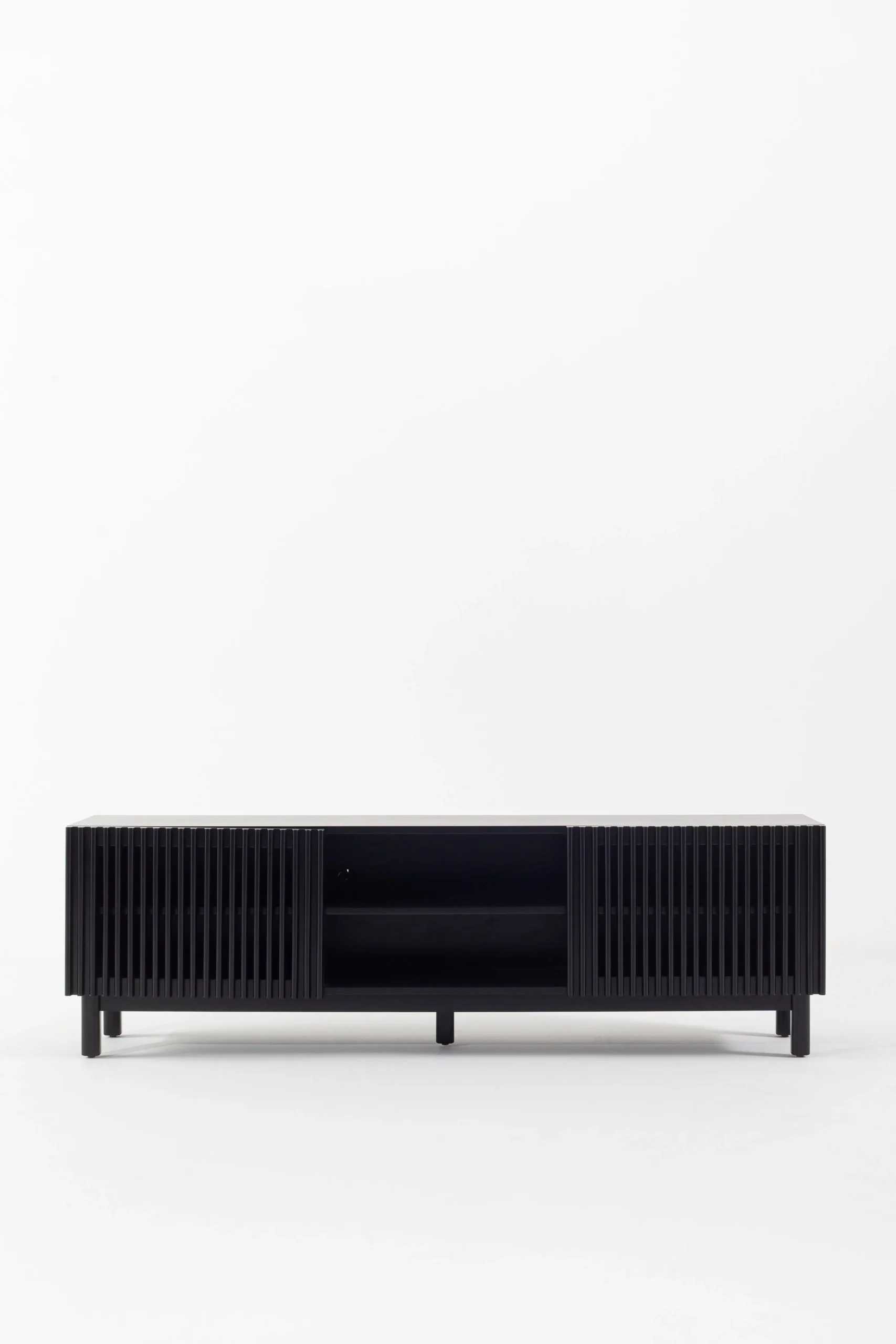 This TV unit features a sleek black finish with a slatted rubberwood frame that enhances modern interiors. Open shelving and concealed storage provide practical space for electronics and accessories, while sturdy legs create a balanced, contemporary look for organized entertainment setups.