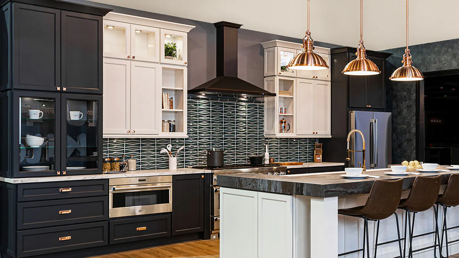 Newcastle Charcoal cabinets feature solid birch frame doors with plywood panels, recessed full-overlay design, soft-close hinges, and full-extension drawers. Adjustable birch plywood shelves provide durable, functional storage with a modern and classic kitchen appeal.