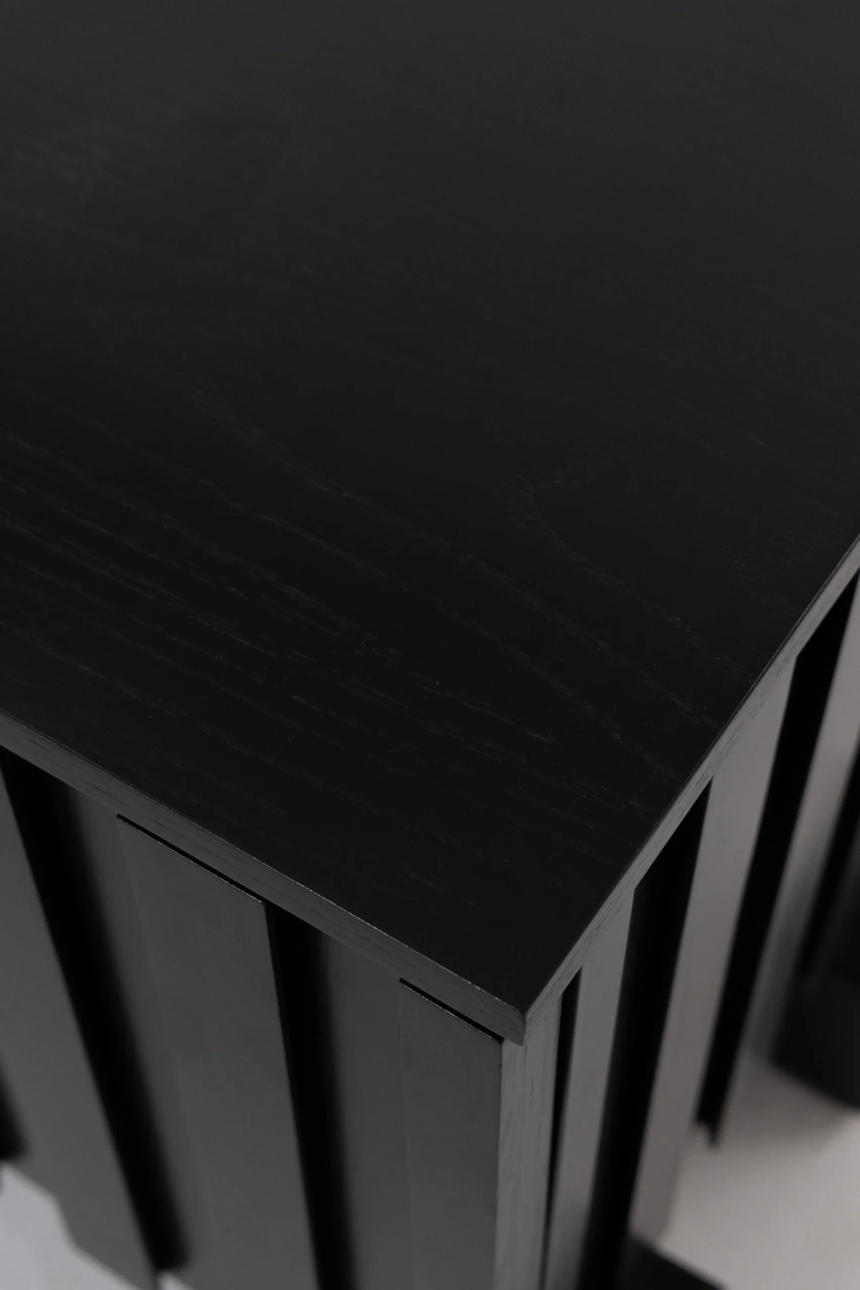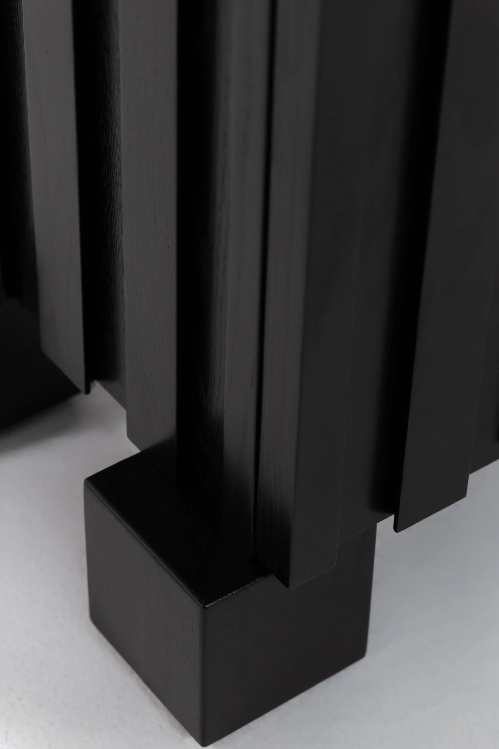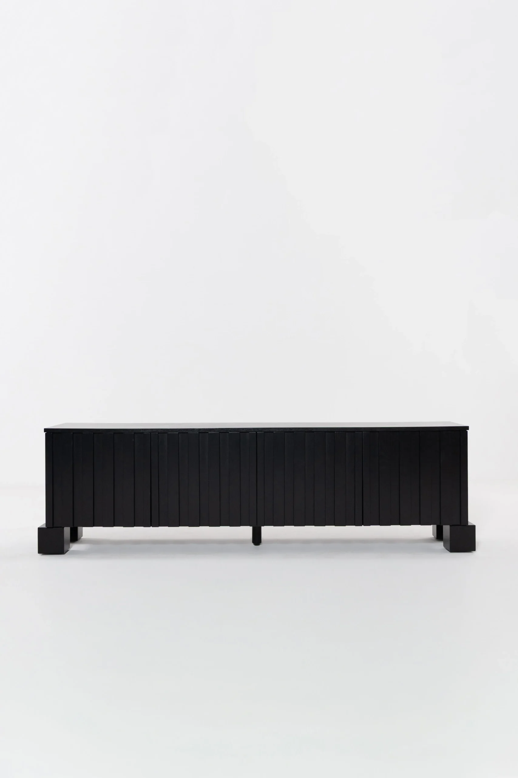 This TV unit features a bold black wood finish with a refined slatted design that enhances modern interiors. Crafted from oak, it offers generous concealed storage behind soft-close doors, keeping media devices and accessories neatly organized while maintaining a sleek appearance.