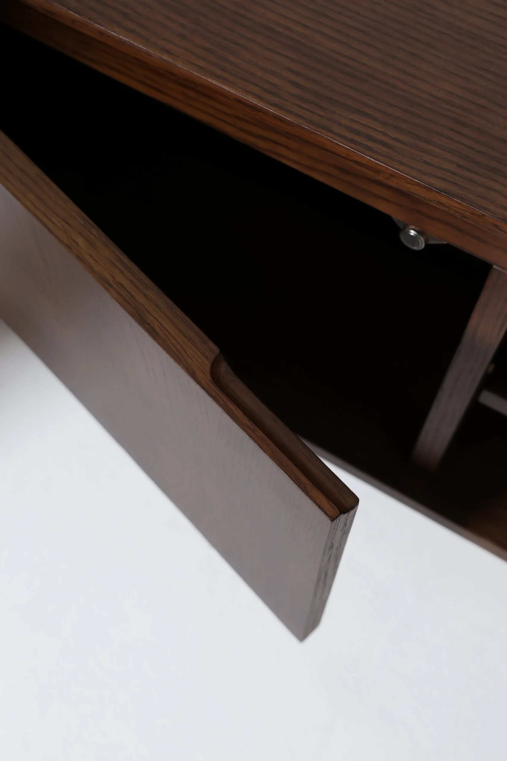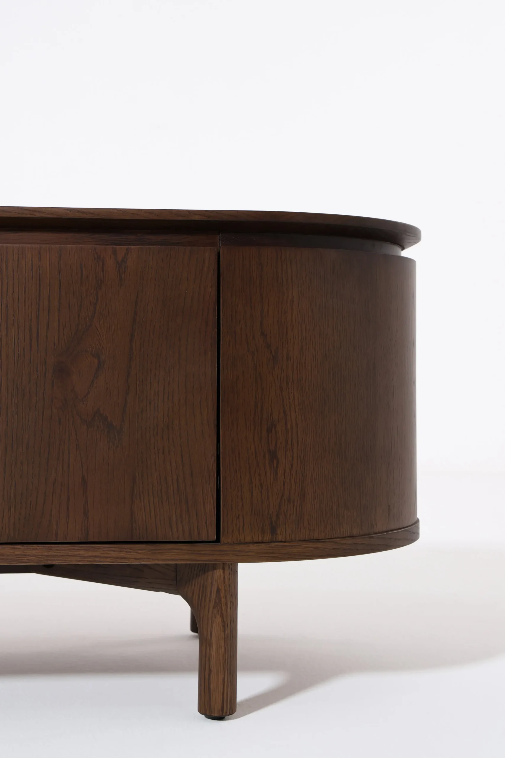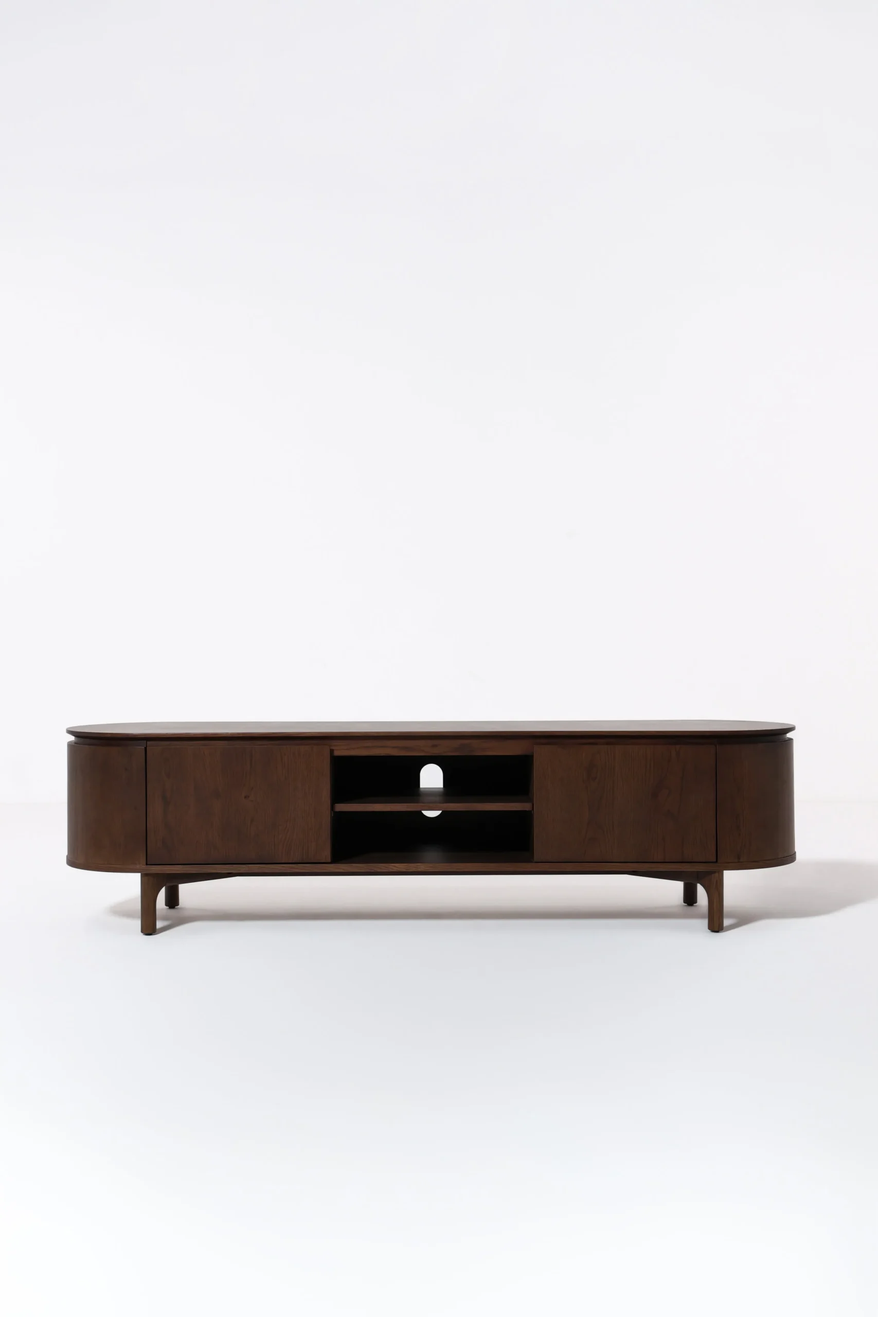 This TV unit features a rich dark oak finish with smooth rounded edges and a curved profile. The clean modern design enhances contemporary and mid-century interiors, while the sturdy wooden structure provides a stylish and functional base for entertainment setups.